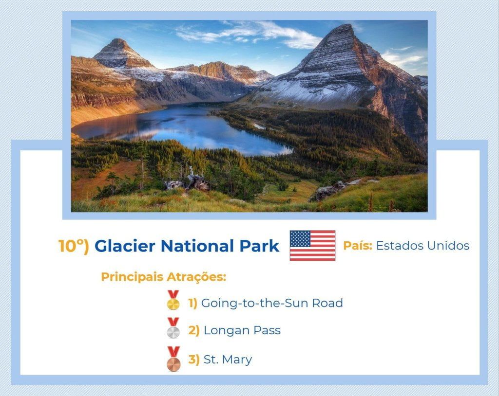 Localizado em Montana nos Estados Unidos, o parque Glacier National Park é um ecossistema com mais de 100 lagos, duas cadeias montanhosa e diversas espécies de plantas. Com mais de 1.000 km de trilhas, o parque é ideal para os amantes da trilha e camping. O passeio panorâmico pela rua Going-to-the-Sun Road, o pico Longa Pass e a lagoa St. Mary estão entre as principais atrações.