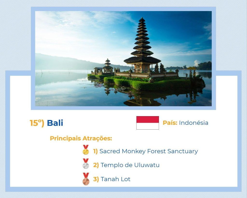 Dentre as mais de 17 mil ilhas da Indonésia, Bali é a ilha mais famosa dentre todas. Conhecida pela gastronomia, praias, templos, e em especial o preço – menor que a maioria das outras cidades turísticas. As principais atrações turísticas são: o santuário dos macacos Sacred Monkey Forest Sanctuary, e os templos Uluwatu e Tanah Lot.
