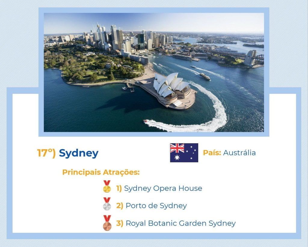 Sydney é a maior cidade da Austrália e concerta cerca de 20% da população do país. Conhecia por sua gastronomia, praia e parques, é uma ótima opção para viagens em família. A Opera House é o principal cartão postal da cidade, que tem o seu porto como um dos locais mais visitados pelos turistas.