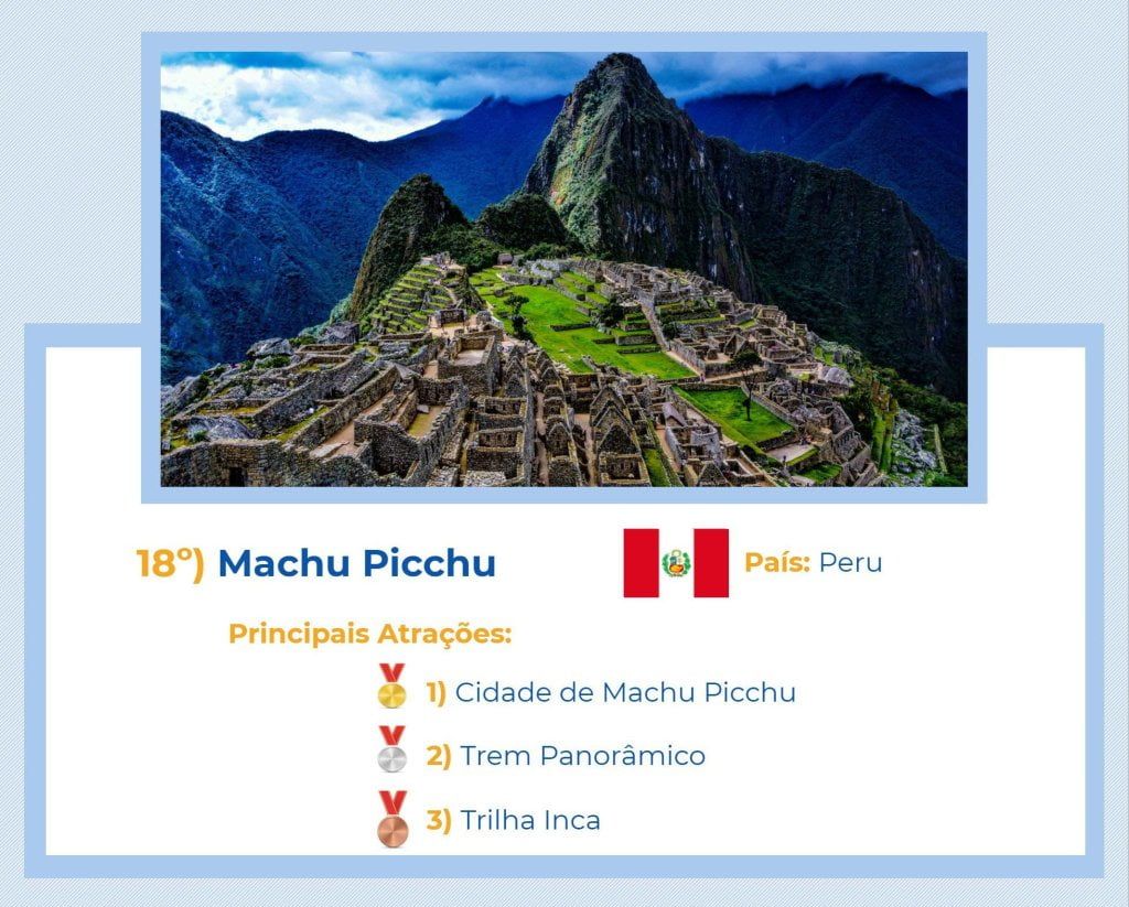 Eleita uma das Novas 7 Maravilhas do Mundo Moderno, Machu Picchu encanta com sua beleza natural. Também conhecida como “a cidade perdida dos Incas”, é considerado por muitos uma experiência inigualável. Uma das melhores opções é chegar á cidade através do trem panorâmico, que além de transporte, também é uma das atrações típica do local.