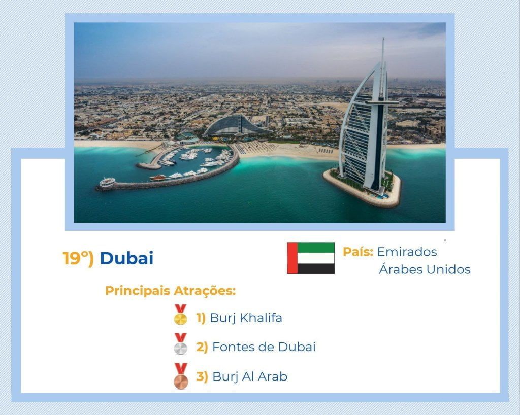 Dubai é uma cidade conhecida pela arquitetura ultramoderna, shoppings e a vida noturna agitada. A cidade abriga o Burj Khalifa (o prédio mais alto do mundo), o shopping Dubai Mall (segundo maior do mundo), e o icônico hotel em formato de vela de barco, Burj Al Arab.