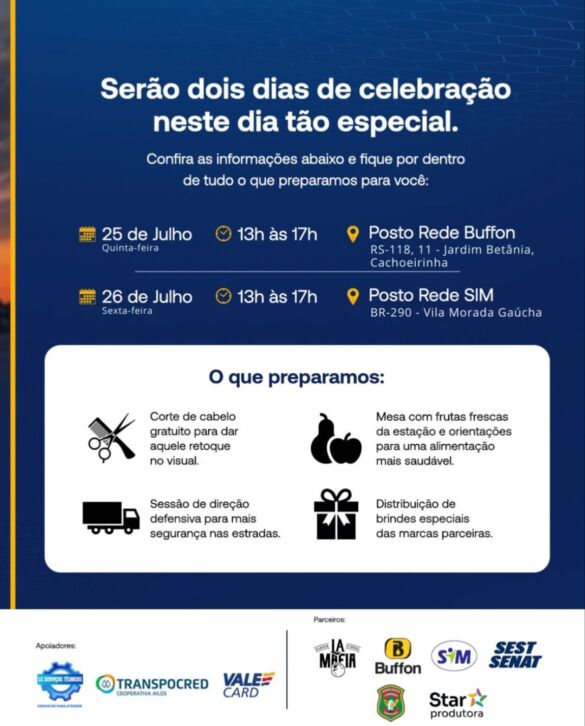 Durante os dois dias de programação, os motoristas de caminhão serão contemplados com diversos serviços gratuitos, como cortes de cabelo oferecidos pelos alunos da escola La Mafia Barber School, orientação sobre direção defensiva ministrada por instrutores do Sest/Senat e uma mesa de frutas para promover uma alimentação saudável. Além disso, no evento em Gravataí serão realizados testes rápidos de saúde, vacinas e orientações sobre saúde geral e saúde bucal pelas enfermeiras da Secretaria Municipal da Saúde de Gravataí. Os motoristas também receberão brindes fornecidos por parceiros.