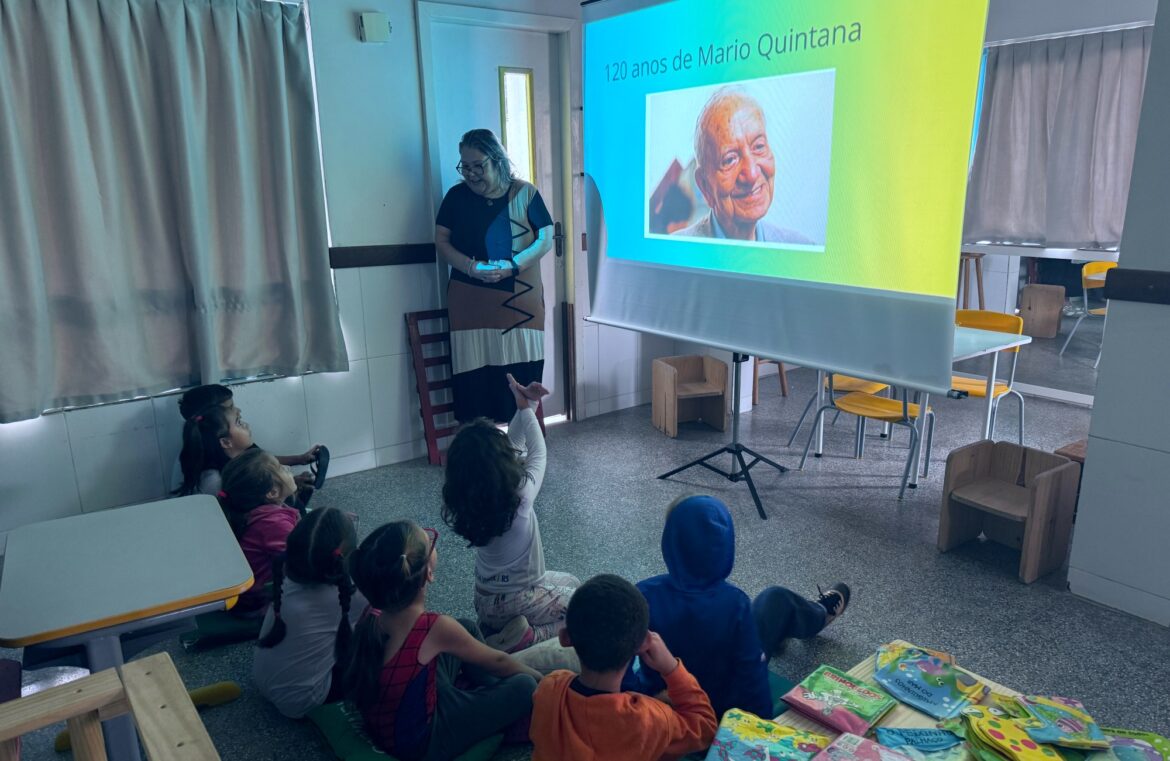 Na manhã de quarta-feira (22), a Escola de Educação Infantil Mundo da Criança, localizada no Centro, recebeu uma das atividades da programação. A professora Tatiana Severo conduziu uma contação de história para alunos do Pré-2, que acompanharam a leitura da poesia “Pé de Pilão” e participaram de uma imersão no universo literário do autor. “Levar a poesia de Mário Quintana para dentro das escolas é como abrir uma janela para o imaginário das crianças. No projeto ‘Entre Versos e Infâncias’, a gente não apenas lê os poemas, mas convida os alunos a sentirem as palavras, a brincarem com os sentidos e a descobrirem que a literatura pode ser leve, divertida e cheia de encanto,” destaca Tatiana.