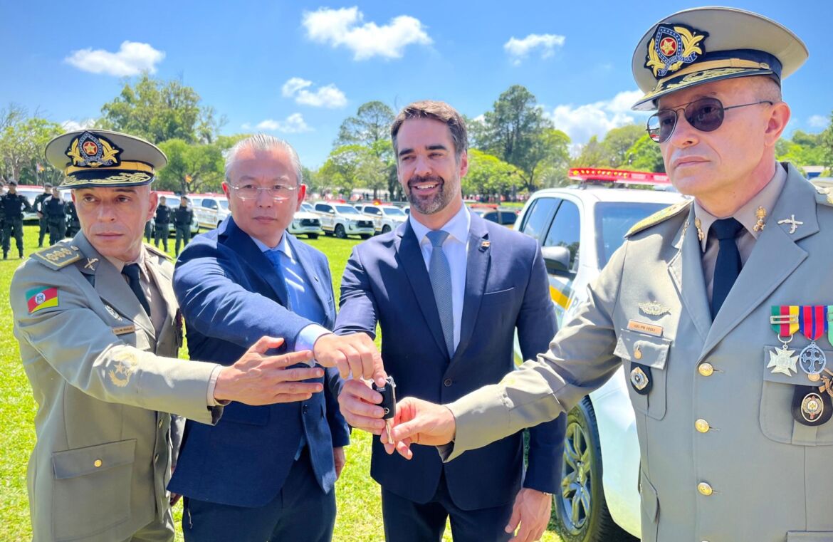 Durante a solenidade, o governador do estado, Eduardo Leite (PSD), o secretário estadual de Segurança Pública do RS, Mário Yukio Ikeda, o Comandante-Geral da Brigada Militar, Cláudio dos Santos Feoli, o Subcomandante-Geral da BM, Douglas da Rosa Soares, e o Chefe do Estado-Maior da Brigada Militar, Luigi Gustavo Soares Pereira. O governador foi quem entregou as viaturas ao comandante-geral da Brigada Militar. A corporação recebeu 25 Toyota Corolla Cross, 178 Toyota Hilux, oito SW4, dois caminhões Mercedes-Benz com plataforma e três caminhões guincho, que passam a reforçar o policiamento ostensivo em todo o estado. Também foram entregues 120 viaturas L200 ao Corpo de Bombeiros Militar e dois caminhões Fly 10 ao Instituto-Geral de Perícias.