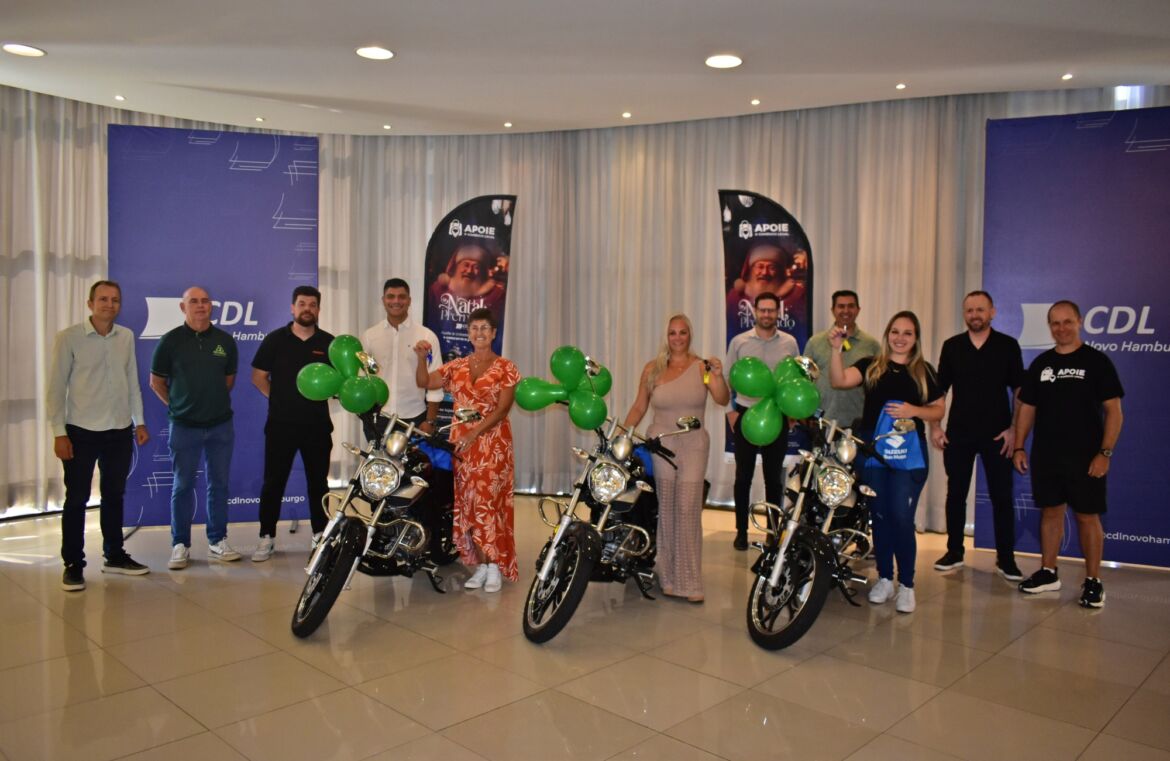 A Câmara de Dirigentes Lojistas de Novo Hamburgo (CDL-NH) realizou a entrega oficial das motos às ganhadoras da campanha Natal Premiado 2025 na tarde desta terça-feira (27). As vencedoras foram Alessandra Becker de Souza, que realizou compra no Posto Ícaro; Grasiele Saiberth Martins, cliente da Lojas Bob; e Rosani Maria Linkes Ramm, que comprou na Madalena Calçados. Durante a entrega dos prêmios, as ganhadoras relataram que não esperavam ser sorteadas e que ficaram contentes com a premiação.