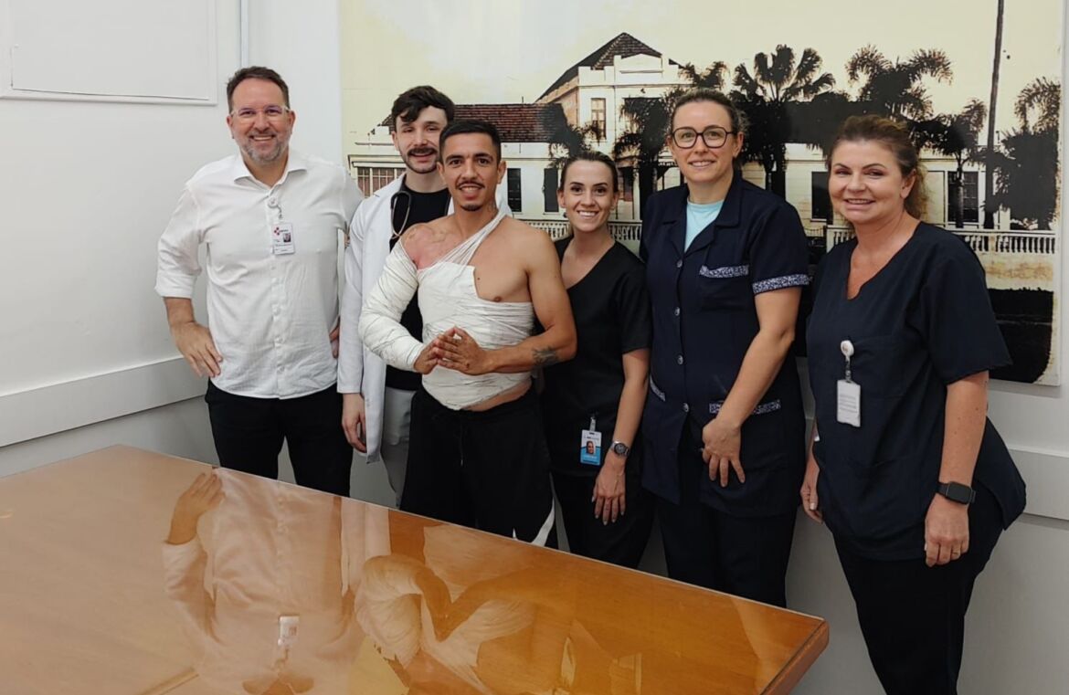 O presidente do Hospital Centenário, Ricardo Silveira, e representantes da equipe assistencial acompanharam Lucas no momento da alta. “Quero agradecer a equipe do hospital e o pessoal do Samu que fez meu primeiro atendimento muito rápido. Assim que cheguei aqui as enfermeiras me deram toda a atenção: faziam meus curativos, davam os remédios para dor e perguntavam se eu estava bem. Foi um tratamento bem especial”, comentou o trabalhador.