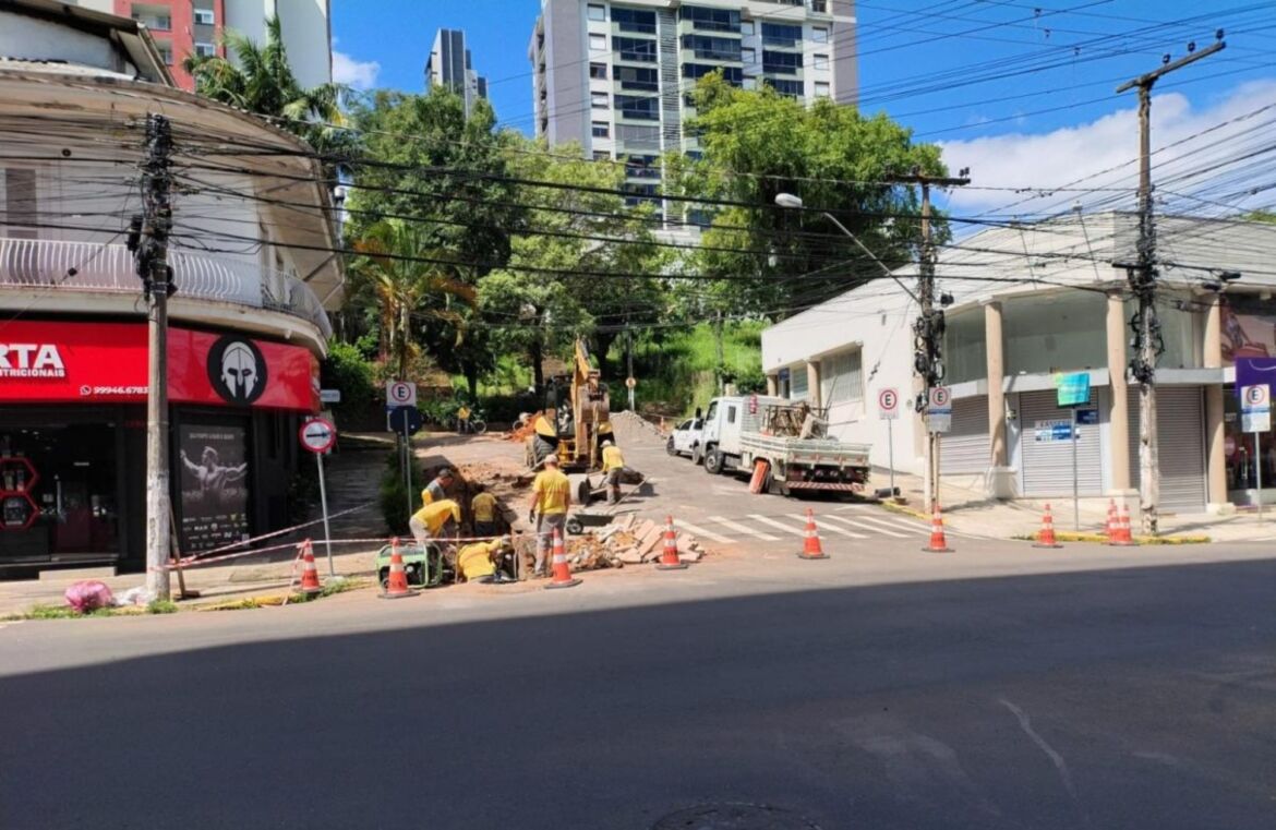 No bairro Centro, a empresa Soluções Imobiliárias MGF Ltda. realiza o reforço de uma rede de drenagem com diâmetro de 400 milímetros sob a pista da Rua Gomes Portinho. A obra ocorre no trecho localizado entre o pé da escadaria e a Rua Bento Gonçalves.