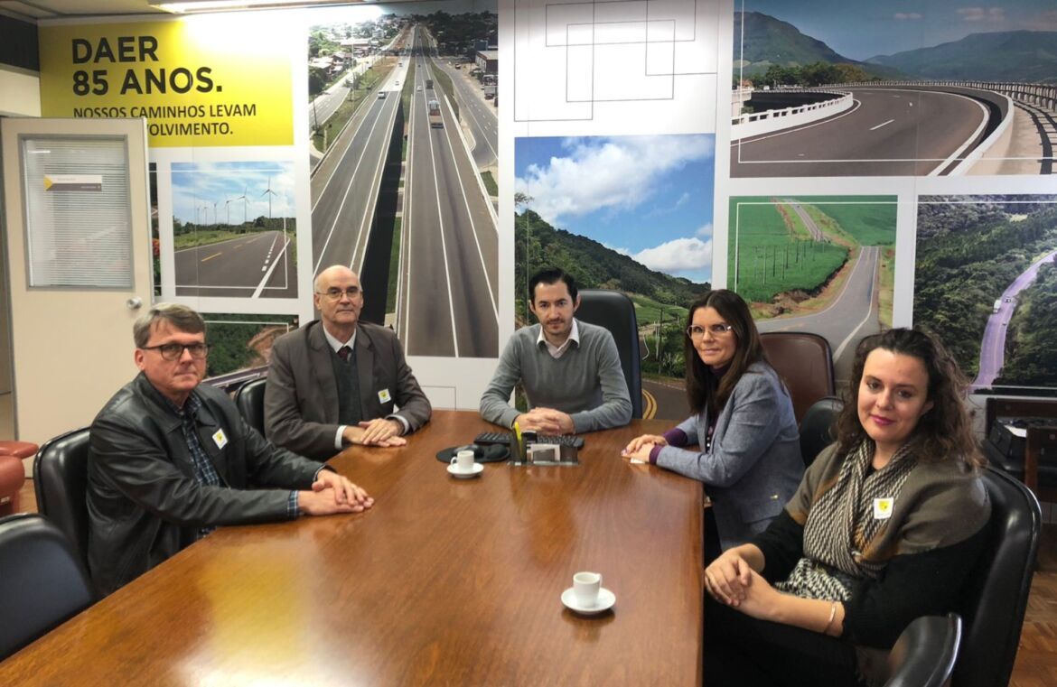 A secretária municipal de Desenvolvimento Urbano e Habitação, Roberta Gomes de Oliveira; a diretora de Desenvolvimento Urbano, Laís Corteletti; e o coordenador do Plano Diretor de Novo Hamburgo, André Brenner; acompanhados pelo assessor jurídico Especial do Gabinete, José Cacio Bortolini, apresentaram ao diretor Faustino as necessidades que o Município tem para salvaguardar o futuro traçado da RS-010 em linha com a revisão do Plano Diretor, que prevê a Rodovia do Progresso como uma rota de escoamento produtivo.