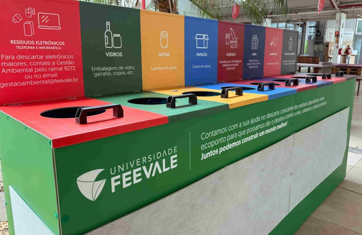 A Universidade Feevale instalou recentemente um ecoponto na Rua Coberta do Câmpus II, em Novo Hamburgo, com o objetivo de incentivar o descarte adequado de resíduos e promover a conscientização ambiental entre os membros da comunidade acadêmica. No local, é possível descartar resíduos eletrônicos, vidro, metal, papel, papelão, plástico, tampinhas plásticas e óleo de cozinha.