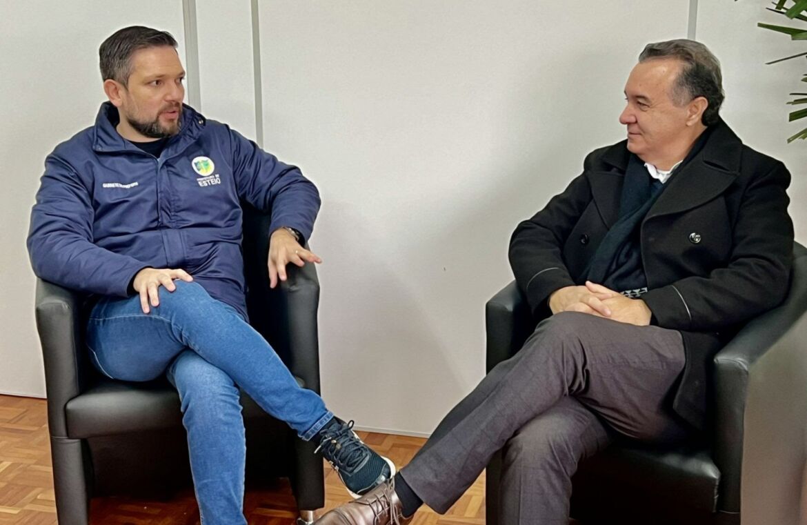 O reitor da Universidade Feevale, José Paulo da Rosa, realizou uma visita ao prefeito de Esteio, Leonardo Pascoal (PL), na manhã desta quinta-feira (11), para estreitar laços entre a instituição e o município. Dentre os temas tratados no encontro, o destaque foi para o Hub Agro, que será inaugurado durante a Expointer deste ano, que acontecerá de 24 de agosto a 1º de setembro, no Parque de Exposições Assis Brasil. O espaço, resultado de parceria entre a Prefeitura e a Feevale, irá fomentar empresas e profissionais para a criação de soluções para o agronegócio.