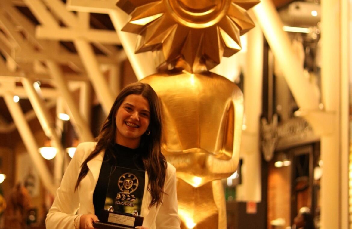 A jovem Maria Eduarda, ex-aluna da rede municipal de ensino de Campo Bom, venceu o prêmio de Melhor Roteiro no Educavídeo, mostra estudantil que integra a programação oficial do Festival de Cinema de Gramado. O reconhecimento foi concedido pelo curta-metragem “E Se…”, exibido durante o evento, que ocorre neste mês na serra gaúcha.