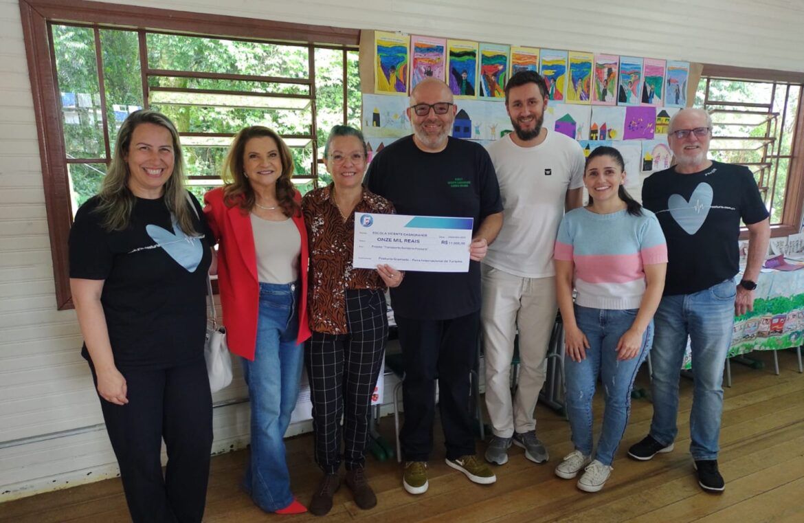 Período de férias chegando e a direção da Escola Municipal Vicente Casagrande, no bairro Altos da Viação Férrea, em Gramado, teve mais um motivo para comemorar. Na última sexta-feira, dia 8, o Festuris entregou o valor de R$ 11 mil para a instituição. O recurso é oriundo de uma das ações do projeto Festuris Cuida.