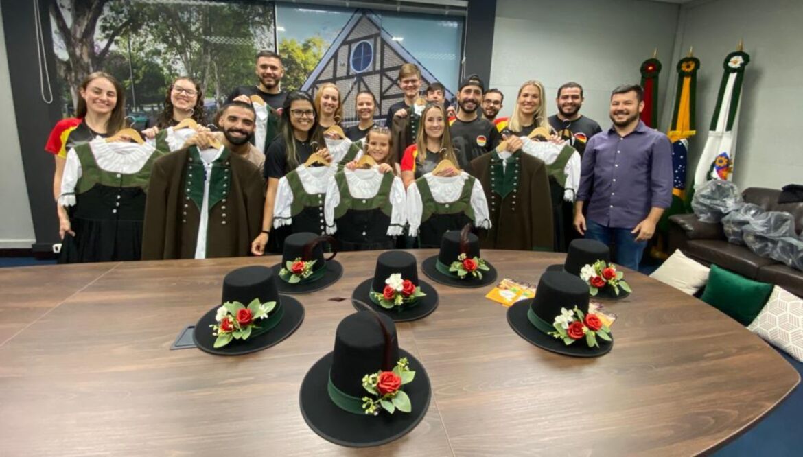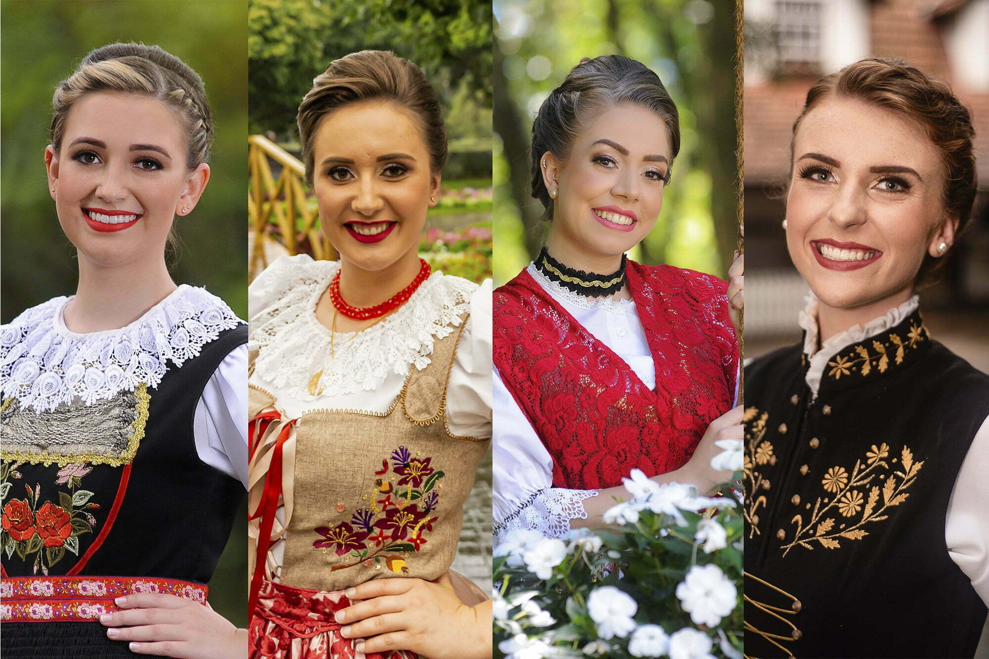 Ana representa o Grupo de Danças Folclóricas Sonnenschein, de Linha Brasil e Linha Araripe. Marluce Maldaner carrega a bandeira do Volkstanzgruppe Tannenwald, do Pinhal Alto. Camila Caroline Schwaab faz parte do Böhmerlandtanzgruppe, de Linha Imperial.