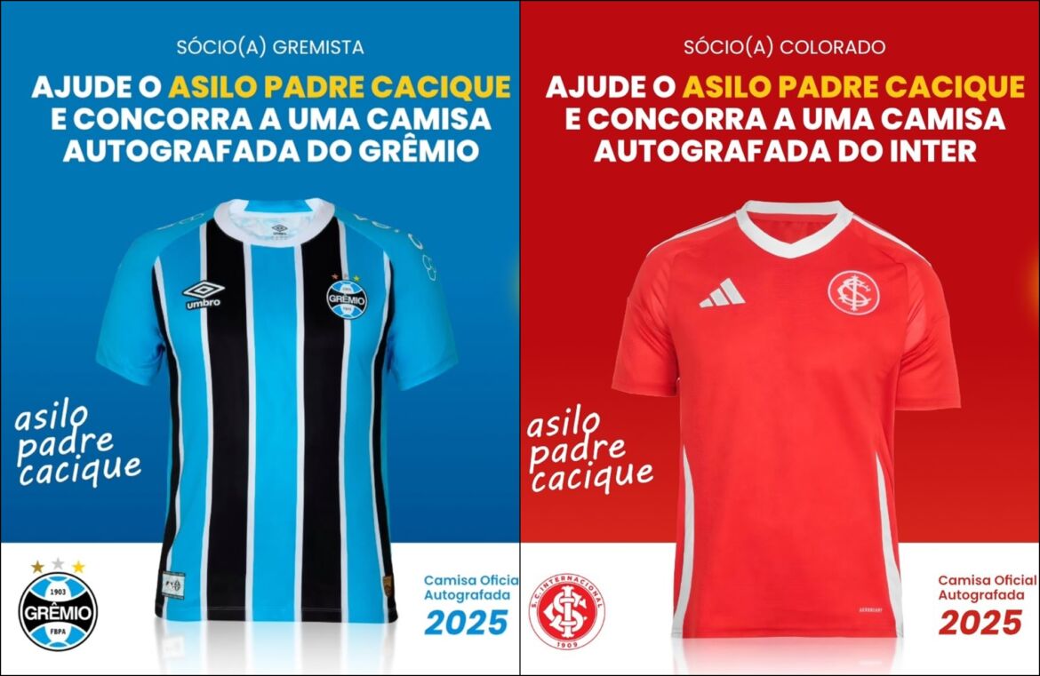 Torcedores dos arquirrivais Grêmio e Internacional iniciaram uma ação solidária que permite concorrer a camisas oficiais autografadas dos clubes mediante doações a partir de R$ 25, feitas via Pix, ao Asilo Padre Cacique, em Porto Alegre. O objetivo da ação é arrecadar recursos para a manutenção das atividades da instituição, que acolhe idosos em situação de vulnerabilidade. O sorteio das camisetas está marcado para o dia 13 de fevereiro.