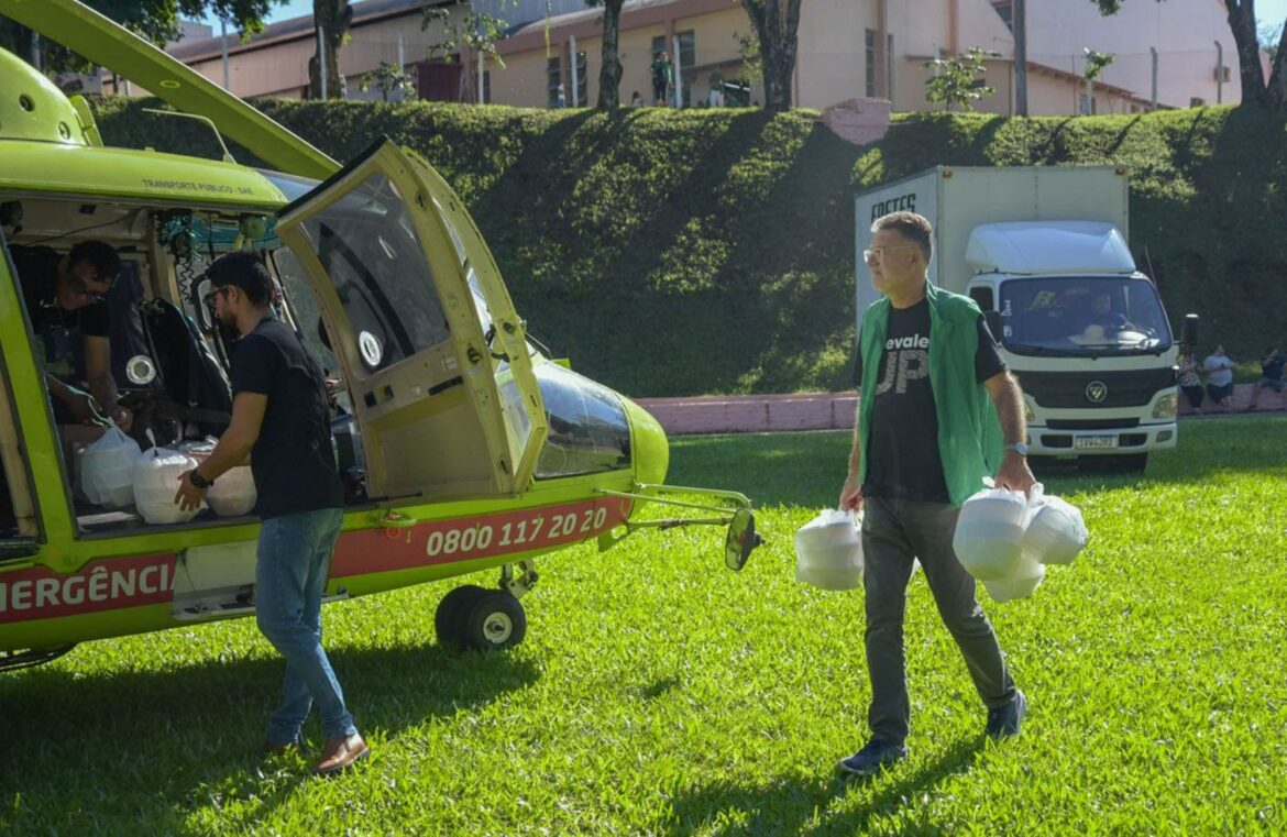 A Universidade Feevale participou, na manhã desta quarta-feira, 8, de duas missões humanitárias aéreas nas cidades de Guaíba e Eldorado do Sul. Cerca de 600 marmitas, preparadas por grupos voluntários da região e reunidas pela Feevale, foram entregues de helicóptero em uma loja da rede Havan em Guaíba, para posterior distribuição a famílias ilhadas. Além disso, um carregamento de cestas básicas foi deixado em um ponto de apoio de Eldorado do Sul, cidade que só pode ser acessada por via aérea.