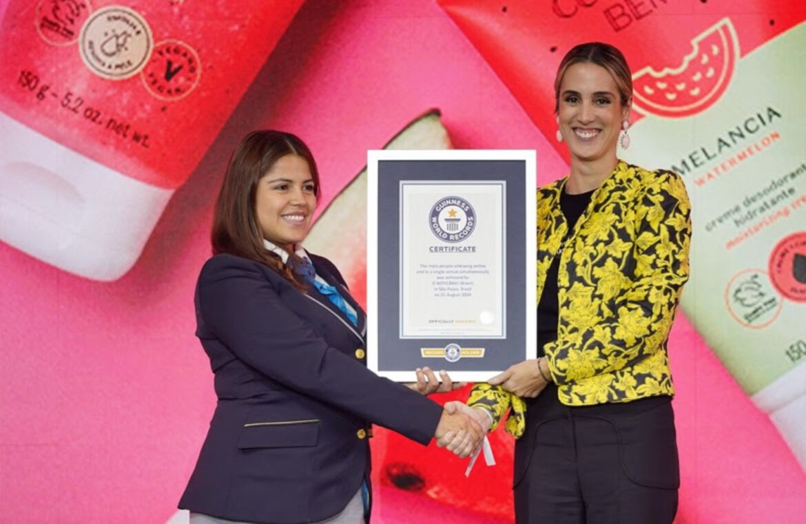 A marca brasileira O Boticário acaba de entrar para o Guinness World Records por causa do maior unboxing simultâneo do mundo. A ação aconteceu nesta quarta-feira (21), no Pavilhão da Bienal de São Paulo, onde mais de 1.080 franqueados, criadores de conteúdo e fãs da marca se uniram para quebrar o recorde e celebrar o lançamento das novas linhas de Cuide-se Bem e EGEO inspirados no cheiro da melancia.