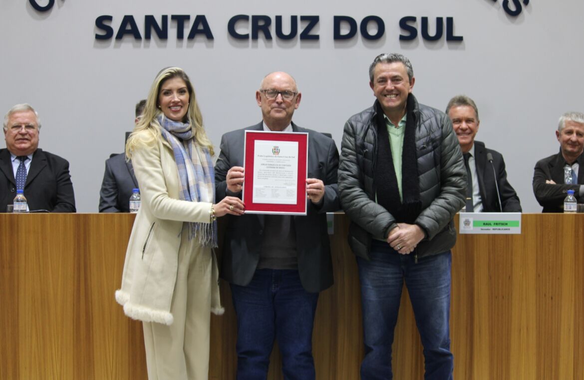 Uma homenagem à Igreja Evangélica de Confissão Luterana pelo aniversário de 200 anos de presença no Brasil foi realizada pela Câmara de Vereadores de Santa Cruz do Sul na noite desta segunda-feira (8). A iniciativa foi da vereadora Nicole Weber (Podemos). O ato ocorreu durante sessão solene no Plenário Vereador Nilton Garibaldi.
