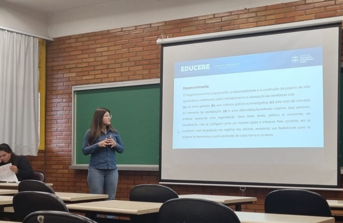 Durante o congresso, educadores sociais e parceiros acadêmicos do Instituto apresentaram pesquisas e experiências vinculadas aos programas institucionais. Um dos trabalhos foi “Oficinas Pedagógicas como Prática Educativa no Programa de Aprendizagem Profissional Rural do Instituto Crescer Legal”, de autoria da educadora social Michele de Cássia Dzindzny, do educador social Adriano Emmel e da professora e pesquisadora Cristhianny Bento Barreiro.