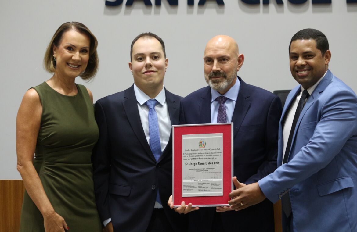 A Câmara de Vereadores de Santa Cruz do Sul concedeu o título de Cidadão Santa-cruzense ao advogado e professor Jorge Renato dos Reis em sessão solene realizada nesta segunda-feira (9). A homenagem foi proposta pelo vereador Professor Cleber (União) e reconhece a atuação de Reis nas áreas do direito, da educação e da participação comunitária no município.