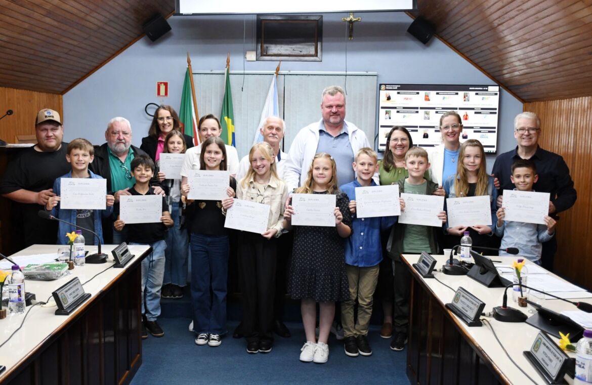 Dez estudantes do quarto ano das escolas municipais de Picada Café assumiram, na terça-feira (21) e na quarta-feira (22), funções simbólicas na administração pública municipal, como parte da edição 2025 do Concurso Prefeito por um Dia. A atividade ocorreu na Câmara de Vereadores e nas dependências da Prefeitura, permitindo que os alunos conhecessem de perto o funcionamento da gestão pública e a rotina das autoridades locais.