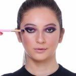 Para realçar os olhos, aplique a sombra preta no canto externo dos olhos, esfumando bem, até que a delimitação entre o preto e o roxo fique “quase” impercetível. Faça o mesmo na parte de baixo dos olhos.