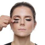 5. O delineador é o ponto forte da make. Então, com um delineado preto, faça um traço “delineado gatinho” iniciando do canto interno até o canto externo dos olhos. Aplique os postiços com auxílio de uma cola;
