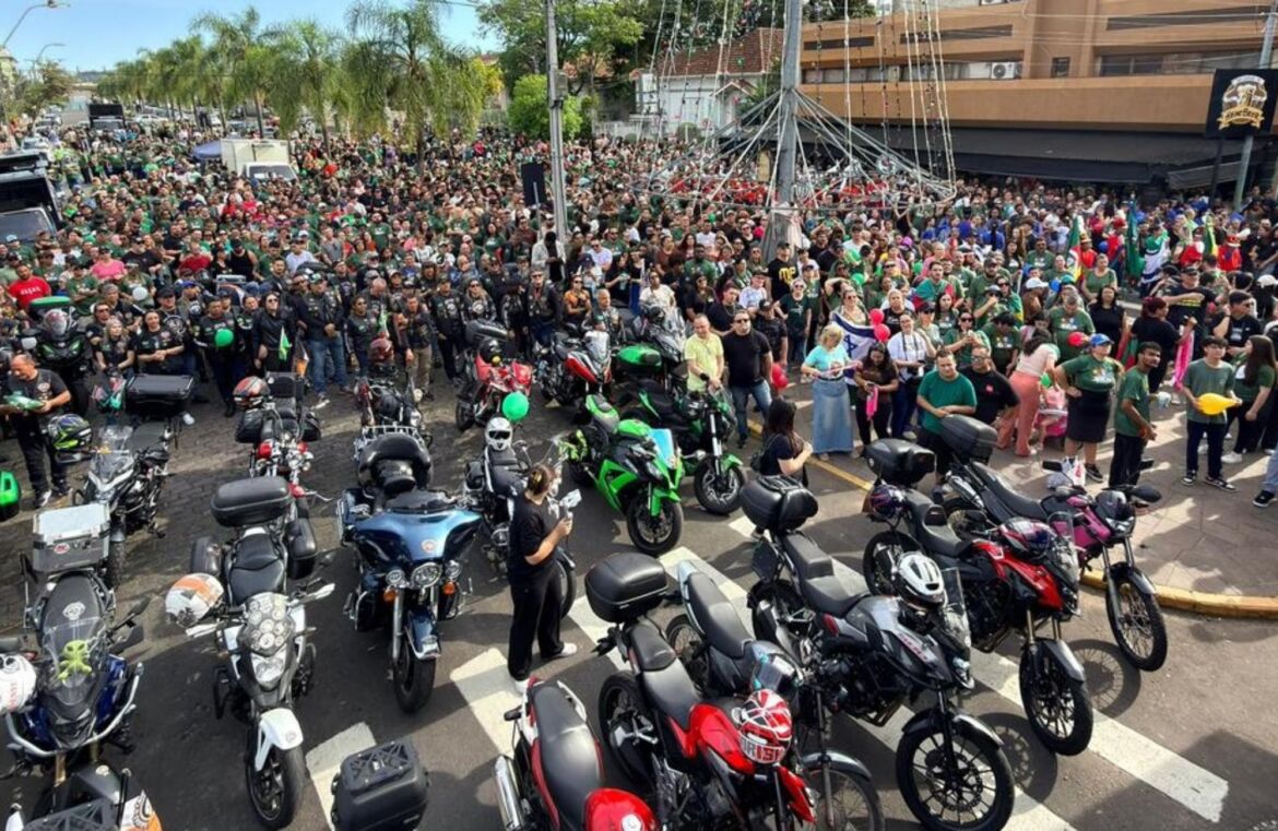 Por volta de 10 mil pessoas participaram da Marcha para Jesus em São Leopoldo neste sábado (1º). O evento, organizado pelo Conselho de Pastores com apoio da Prefeitura, percorreu a rua Independência até o Ginásio Celso Morbach, no centro da cidade, reunindo fiéis em um ato público de celebração da fé cristã. A programação contou com apresentações de bandas gospel, entre elas a Brasa Church, além de momentos de oração, louvor e manifestações religiosas.