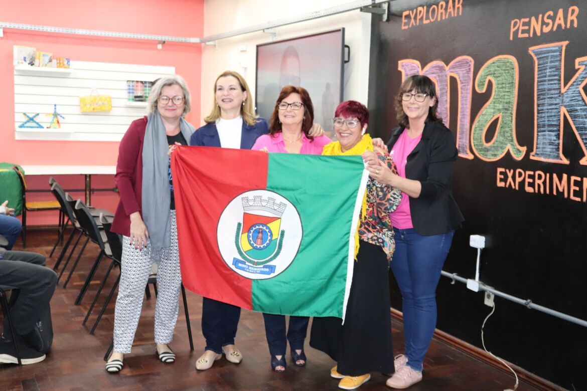 Ainda no turno da manhã, a EMEB Profª Adolfina Diefenthäler recebeu mais uma importante homenagem, desta vez da Rede Municipal de Ensino. Durante reunião de diretores das escolas municipais e coordenadores de espaços pedagógicos, a secretária Maristela enfatizou a grandeza do êxito para a educação pública da cidade. “Estar entre as melhores do mundo é a grande conquista da escola. É um feito gigante que mostra a qualidade do trabalho que desenvolvemos aqui”, afirmou a titular da pasta, que também apresentou um vídeo com imagens da trajetória da escola no prêmio.