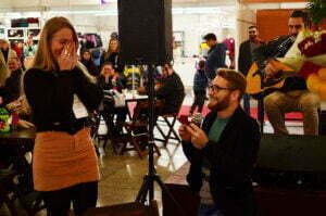 O show de Tommy Wharta na praça de alimentação do Espaço Malha foi interrompido às 15h30 do domingo, 12. E o motivo, nobríssimo! No Dia dos Namorados o amor exalava por todos os espaços. E ali, em frente à centenas de pessoas, Arthur Sperafico, pegou o microfone e pediu a atenção de todos. Há poucos metros de onde estava sua namorada, Natacha Luiza Hahn, trabalhava no caixa da NLH Malhas, sua empresa.