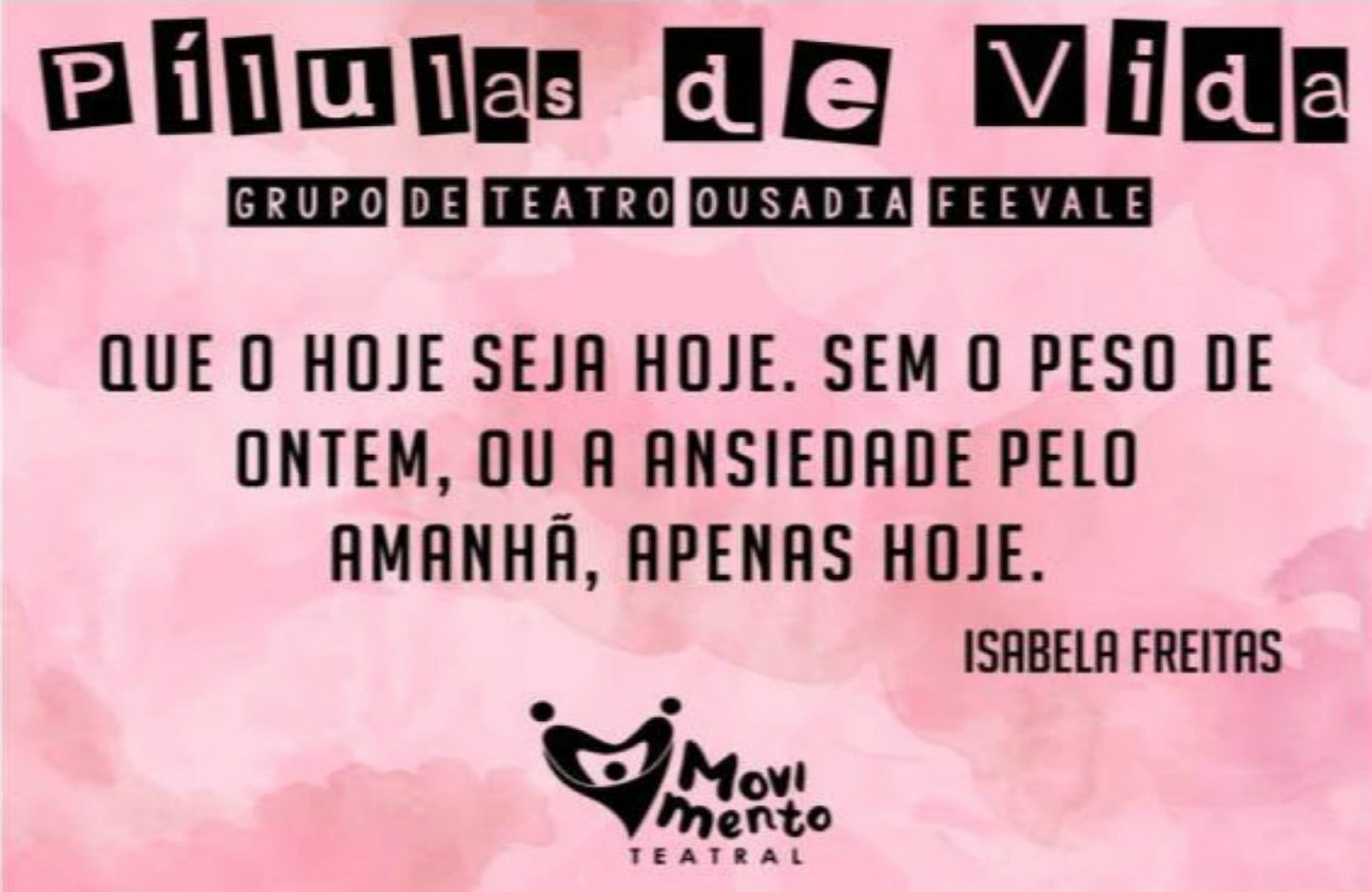 O Movimento Teatral Feevale está realizando, neste mês de julho, atividades voltadas ao grupo Ousadia, composto por idosos. No grupo de WhatsApp da turma, estão sendo disseminadas as Pílulas da Vida, com o objetivo de desencadear conversas e trocas de informações entre os beneficiários do projeto social. Os responsáveis pelas postagens e interlocução com o grupo são os acadêmicos Eduarda Bauermann e Kaell Judá da Silva.