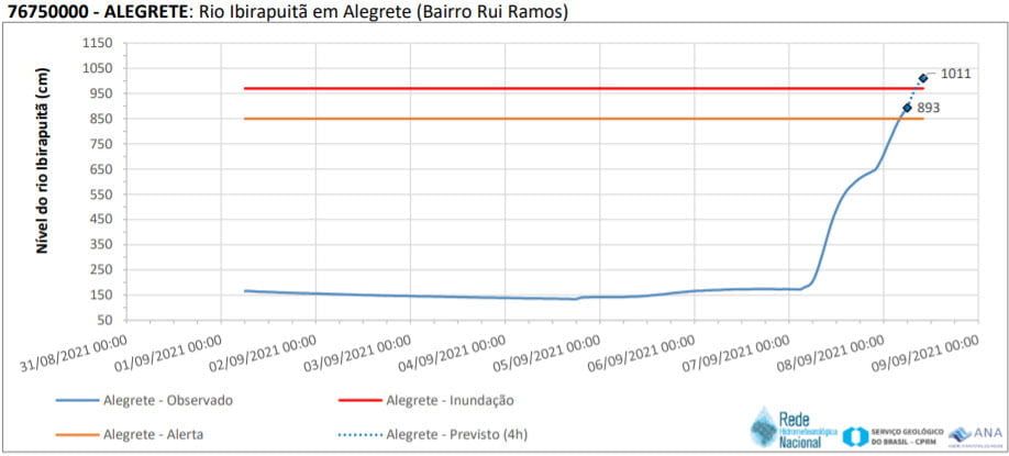 De acordo com o SGB, o alerta foi ativado devido ao aumento dos níveis dos rios, causado pelo grande volume de chuva acumulado nos últimos dias em municípios como Alegrete, Quaraí, São Borja, Uruguaiana, Manoel Viana e Rosário do Sul.