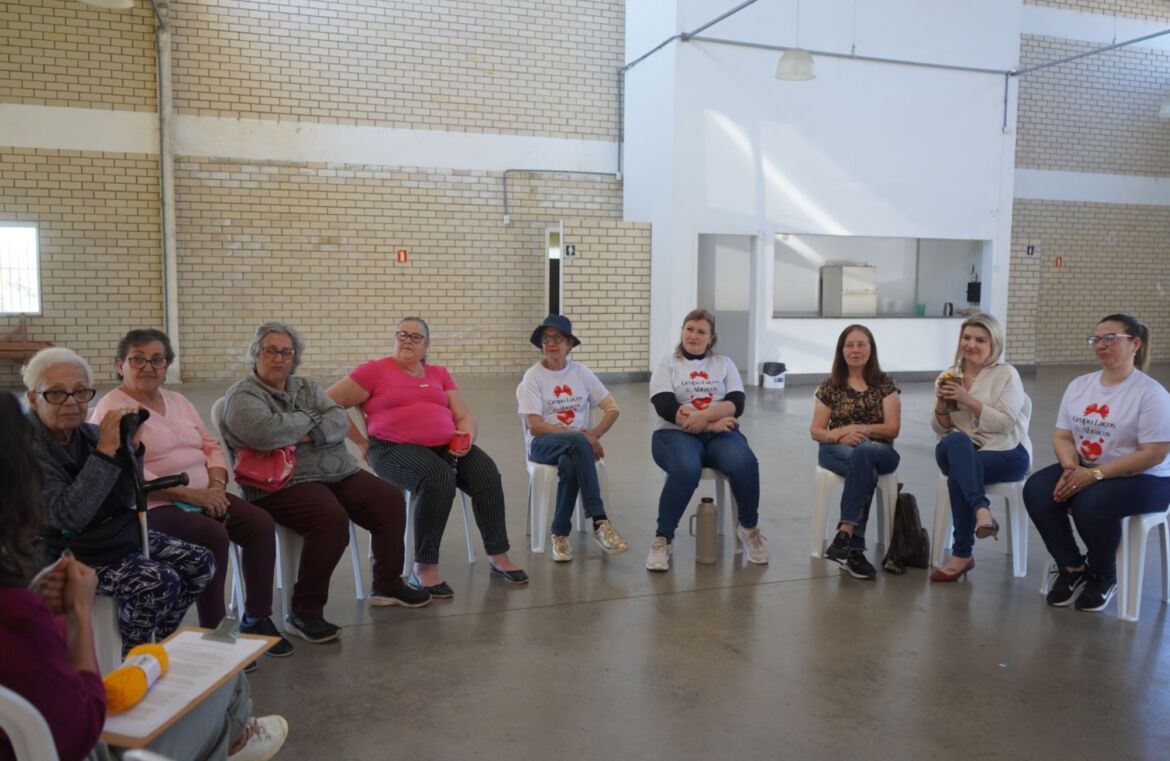 Previsto inicialmente para ocorrer ao ar livre, o encontro foi transferido para o espaço interno da Casa de Cultura Joaneta. A maestrina Cândida Maldaner conduziu a atividade com canções selecionadas especialmente para a ocasião, acompanhadas pelo som do violão, em um momento de escuta e partilha.