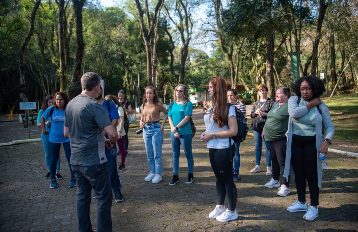 Exemplo disso foi a atividade de campo na área de ciências conduzida pelo professor e biólogo Luciano Becker Pedroso. Ele levou um grupo de professores de biologia até o Parque da Gruta. “Aqui vamos discutir as possibilidades deste tipo de trabalho pedagógico, relacionado às questões ambientais”, explicou.