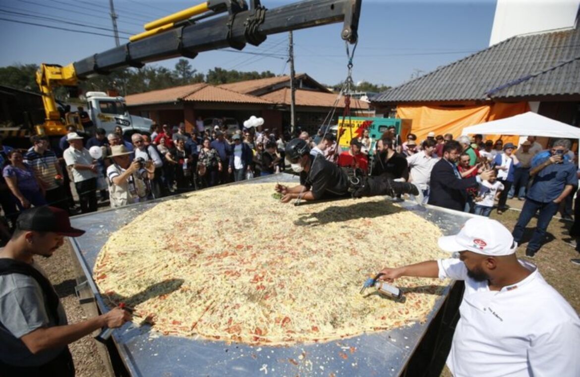 O objetivo, alcançado, foi a produção de uma pizza gigante com 7 metros de diâmetro. O recorde anterior (de 2019) era de uma pizza de 3,46 metros de diâmetro.