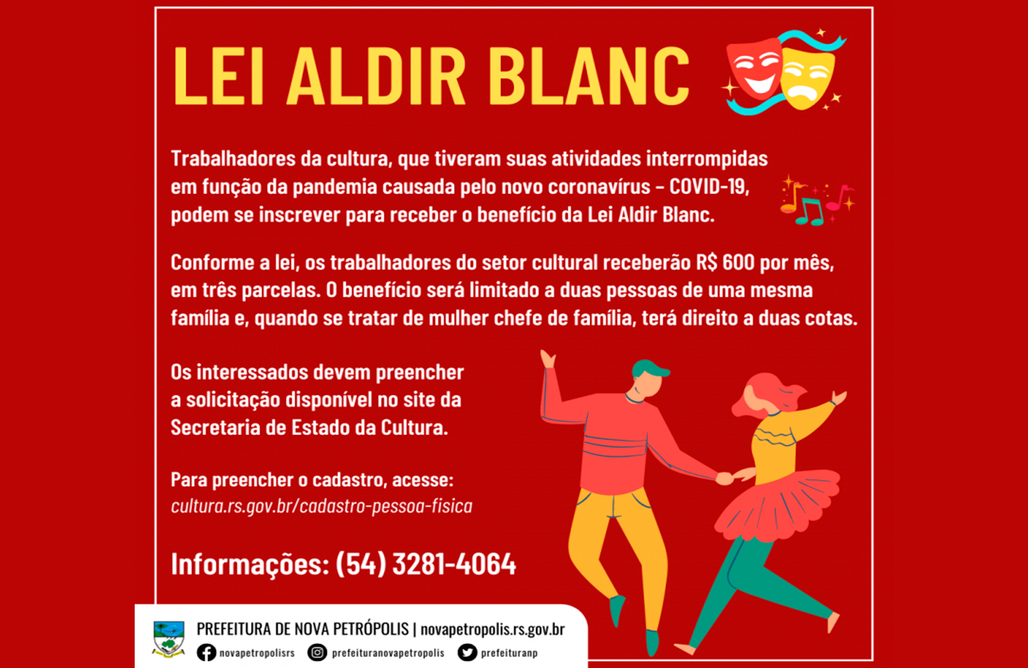 A Lei Federal nº 14.017/2020, de 29 de junho de 2020, Lei de Emergência Cultural – Aldir Blanc, dispõe sobre ações emergenciais destinadas ao setor cultural durante o estado de calamidade pública em virtude da pandemia causada pelo novo Coronavírus (COVID-19). A União depositará aos Estados, ao Distrito Federal e aos Municípios, em parcela única, no exercício de 2020, o valor total de R$ 3 bilhões para aplicação, pelos Poderes Executivos locais, em ações emergenciais de apoio ao setor cultural. Nova Petrópolis deve receber R$ 169 mil para auxiliar o setor.
