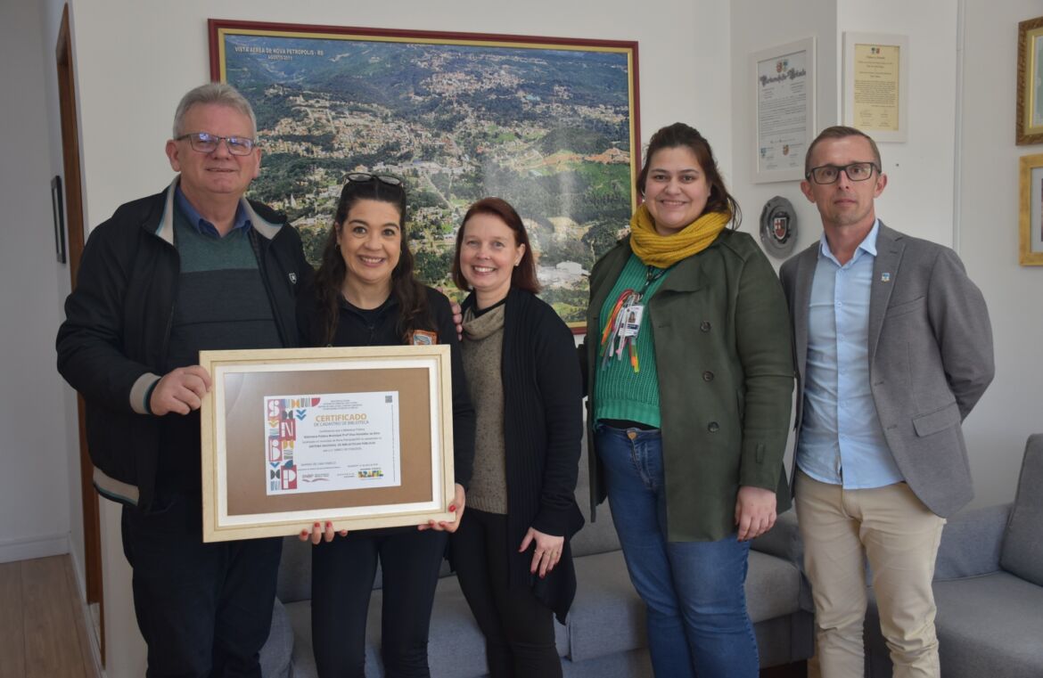 Para marcar o recebimento do certificado, o prefeito de Nova Petrópolis, Daniel Carlos Michaelsen (Republicanos), a secretária Municipal de Educação e Desporto, Caroline Andréia Kehl Matter, o secretário Municipal de Administração, Paulo Marcos Schwantz, a diretora do Departamento Municipal da Cultura, Iasmin Schmitt, e a bibliotecária Susana Carrasco participaram de um ato simbólico no gabinete do executivo.