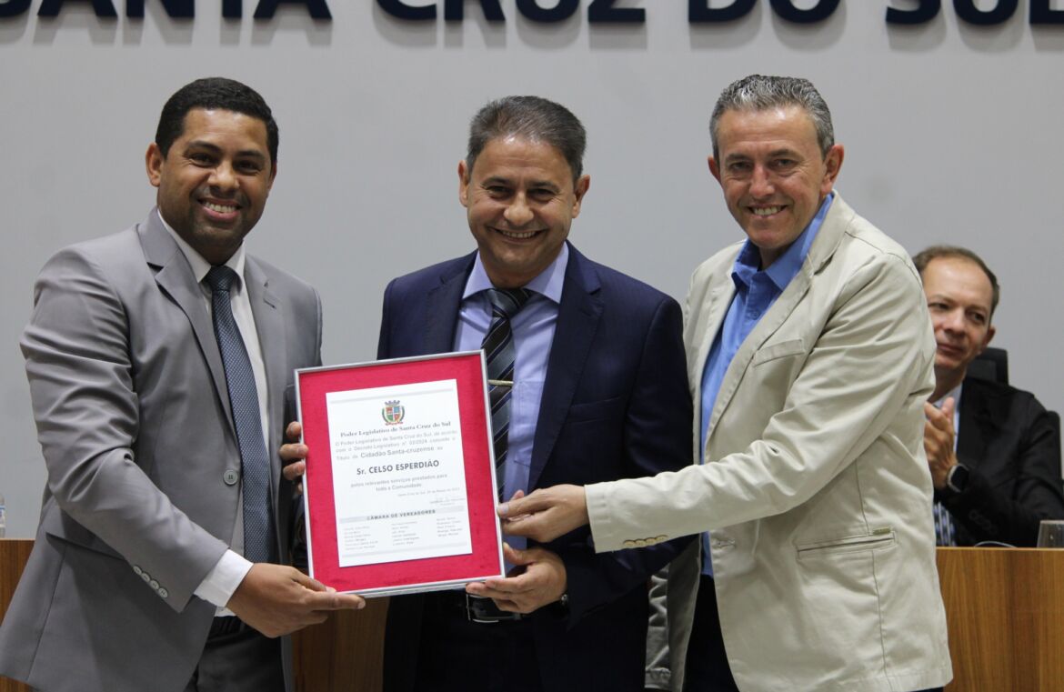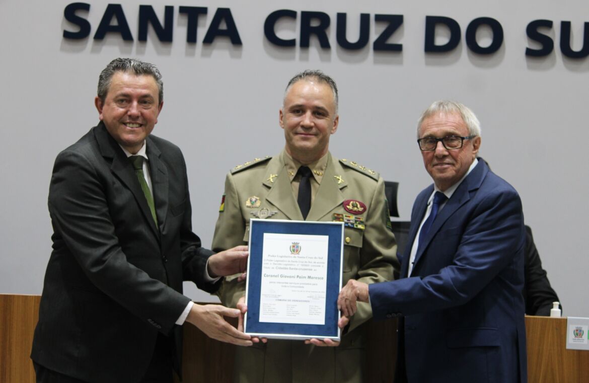 A Câmara de Vereadores de Santa Cruz do Sul entregou o título de Cidadã Santa-cruzense à professora Luciana Antonia Tremea em sessão solene na realizada nesta segunda-feira (16). A homenagem foi proposta pela vereadora Nicole Weber (Podemos). A cerimônia foi conduzida pelo presidente do legislativo santa-cruzense, Gerson Luís Trevisan (PSDB), e contou com a presença do primeiro secretário da Câmara, Raul Gilnei Fritsch (Republicanos), além do esposo da homenageada, Jaime Laufer, e do filho, João Vitor Tremea Laufer.