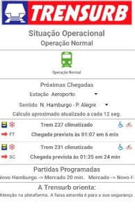 Disponível para smartphones Android, o aplicativo Trensurb Mobile recebeu atualização nesta semana, passando a contar com novas funcionalidades. A principal delas é que a página inicial do app, além de apresentar a situação operacional do metrô, agora também exibe quais serão os dois próximos trens a chegarem à estação mais próxima e qual sua previsão de chegada. O aplicativo identifica automaticamente qual é a estação mais próxima por meio da localização do aparelho, porém é possível também selecionar qualquer uma das 22 estações da linha. Anteriormente, era necessário acessar o menu ‘Informações das Estações’ e abrir a página de cada estação para consultar a estimativa de tempo de chegada dos próximos trens.