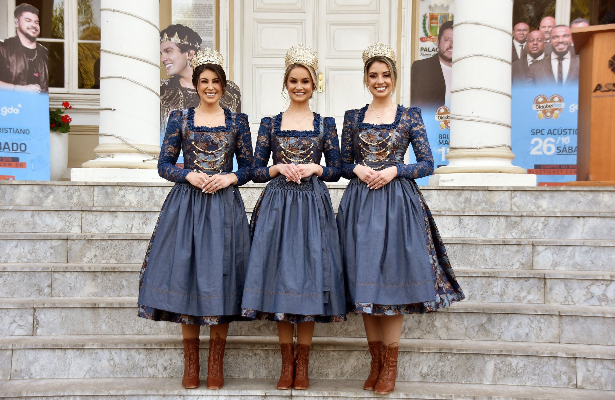 O espírito destemido dos imigrantes alemães que há 200 anos encararam o mar em uma jornada incerta em busca de um novo lar está estampado nos trajes do trio de soberanas da 39ª Oktoberfest formado pela rainha Tatiane Caroline Voese D’Avila, e pelas princesas Karoline Ribeiro Klaus e Nathalia Konzen da Silva. Os vestidos, oficiais e de passeio, foram apresentados para a comunidade em evento realizado neste domingo, 11, na Praça da Bandeira, e trazem consigo em cada detalhe, desde as cores até os tecidos, uma viagem no tempo que retrata a coragem, a esperança e a resiliência dos antepassados.