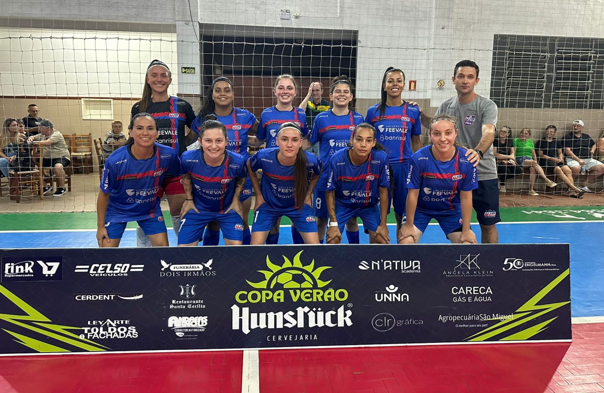 A UJR/Feevale/Banrisul estreou com vitória na Copa Verão Hunsrück 2026 ao derrotar o Partiu Viagem por 8 a 1 nesta sexta-feira (23), no Ginásio Santa Cecília, em Dois Irmãos. Os gols da equipe hamburguense foram marcados por atleta Silvia, duas vezes, além de atleta Evelin, atleta Victória, atleta Yasmin, atleta Sofia e atleta Mayara.