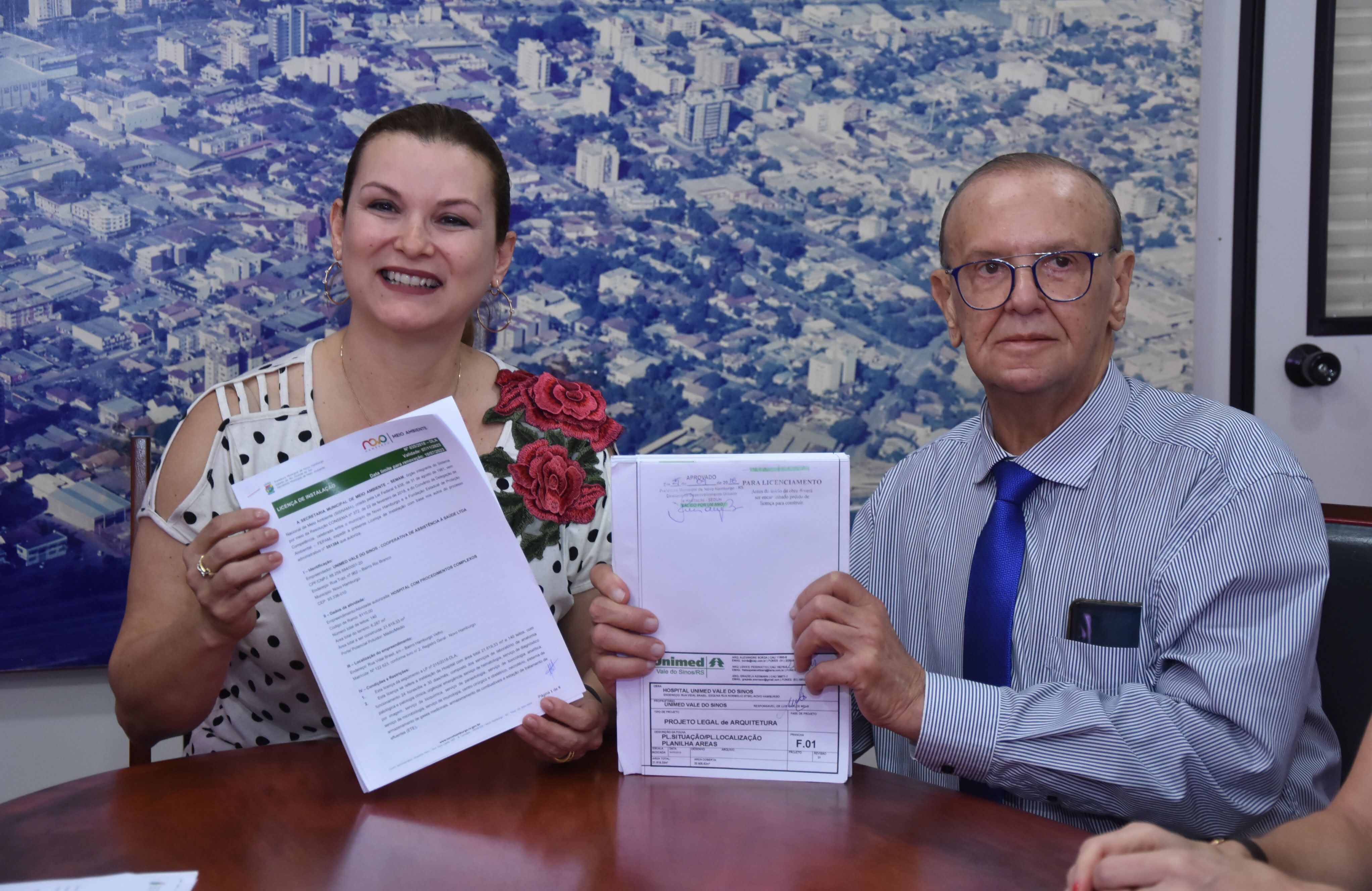 A Prefeitura de Novo Hamburgo entregou para a Unimed Vale do Sinos, na tarde desta terça-feira (13), a Licença de Instalação (LI) e o Projeto Legal de Arquitetura do futuro hospital da cooperativa, que será construído na Rua Barão de Santo Ângelo, em frente à entrada principal do Parcão. O ato, realizado no Centro Administrativo Leopoldo Petry, contou com a presença da prefeita Fátima Daudt e do presidente da Unimed, Dr. Luís Carlos Melo (na foto em destaque).