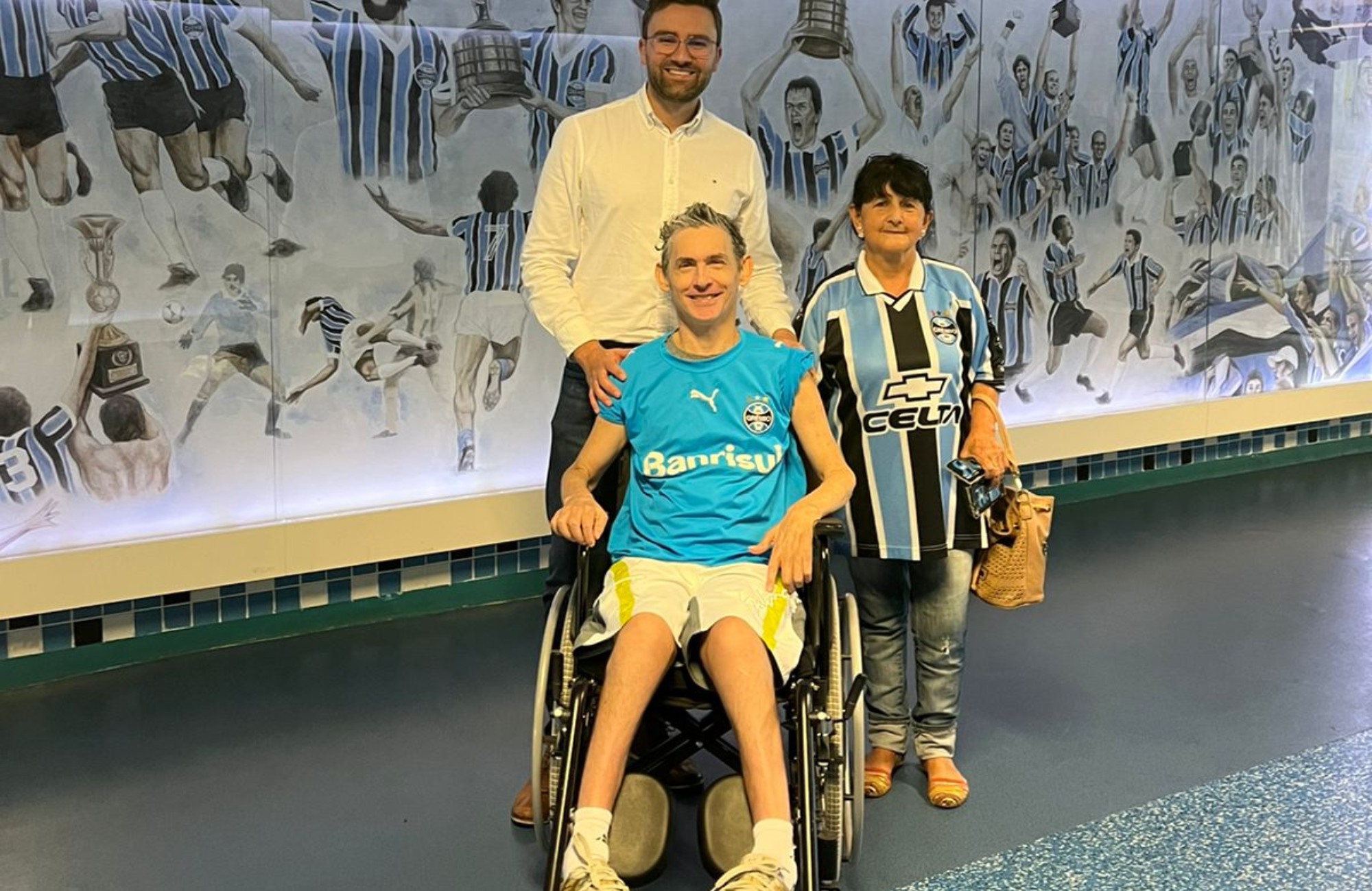 O paciente da Unimed Lar (serviço da Unimed Vale dos Sinos que permite que os pacientes sejam atendidos em casa), Carlos Rafael Carvalhães, que completou recentemente 47 anos, ganhou de presente de aniversário a realização de um sonho. O médico da Unimed Vale do Sinos, Dr. Rafael Vilanova, levou, na última quinta-feira (27) Carlos e sua mãe Nariman para conhecer a Arena, estádio do seu time favorito, o Grêmio. O paciente, curado há pouco tempo, lutou contra um câncer de pâncreas.