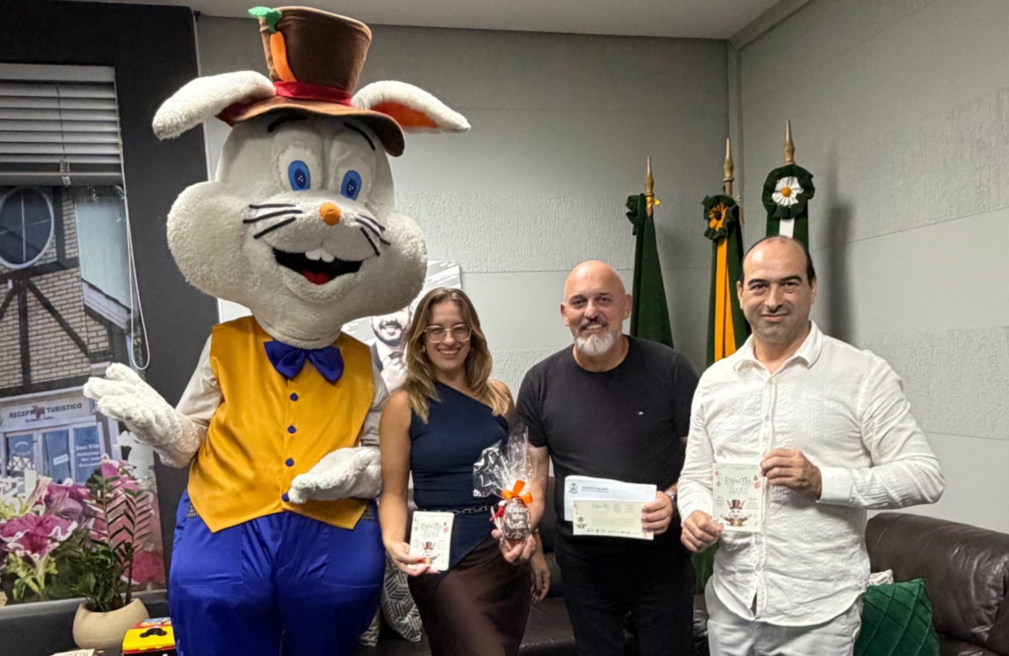 A Prefeitura de Estância Velha recebeu uma comitiva da 4ª Páscoa em Ivoti na tarde desta terça-feira (17). A visita institucional reuniu representantes das duas cidades para divulgar o evento regional e reforçar o convite à comunidade. O encontro foi realizado na sede do executivo estanciense e contou com a presença do vice-prefeito de Estância Velha, Airton Haag, do vice-prefeito de Ivoti, Alexandre dos Santos, da secretária de Turismo, Cultura e Desporto de Ivoti, Raiama Trenkel, além do mascote Pascoalito.