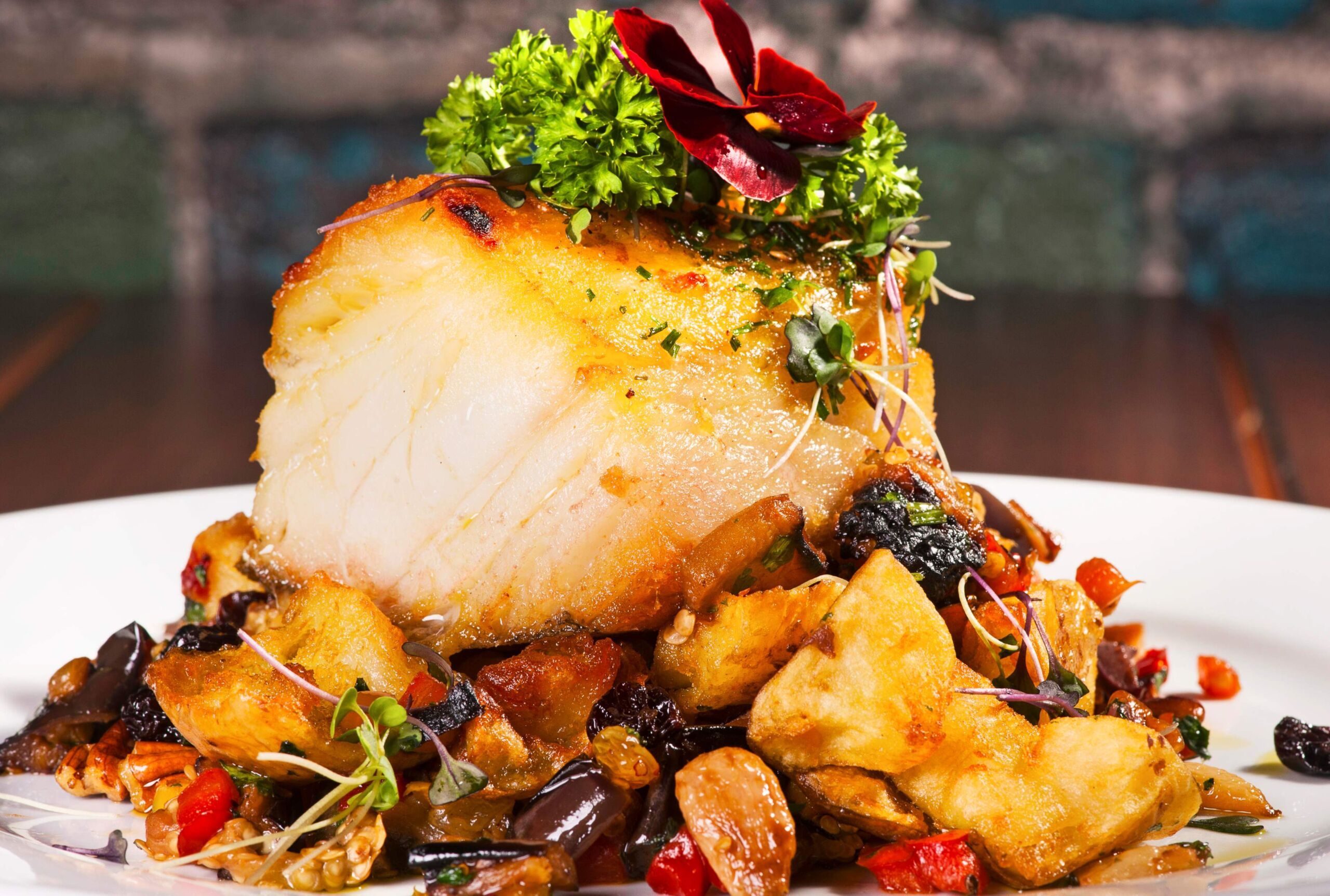 Josephina: Posta de bacalhau confitada acompanhada de purê de batata, tomatinhos assados, azeitonas pretas e caponata.