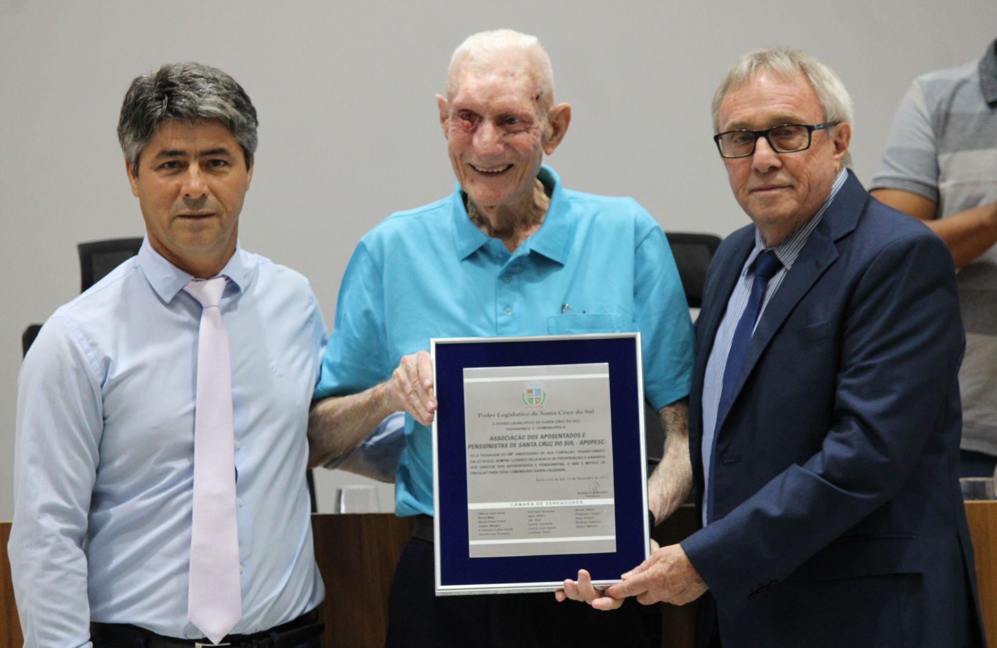 A Câmara de Vereadores de Santa Cruz do Sul realizou sessão solene na sexta-feira (16), para a entrega de uma homenagem à Associação dos Aposentados e Pensionistas de Santa Cruz do Sul (Apopesc) pela passagem do seu 40º aniversário. A proposição foi do vereador Francisco Carlos Smidt (PSDB). A sessão foi conduzida pelo vice-presidente do Legislativo, Luizinho Ruas (PSD), e contou com a presença do vice-secretário da Câmara, Cléber Pereira, e do presidente da Apopesc, Germano Fernando Kelber.