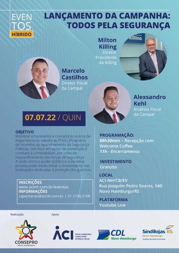 A Associação Comercial, Industrial e de Serviços de Novo Hamburgo, Campo Bom e Estância Velha (ACI) sedia, nesta quinta-feira, 07, o lançamento da campanha Todos Pela Segurança. O objetivo da ação é mobilizar empresários e contadores acerca da importância da adesão ao Programa de Incentivo ao Aparelhamento da Segurança Pública (Piseg), com foco em ações de prevenção e combate à criminalidade, por meio do reaparelhamento das forças de segurança. O evento ocorre no auditório da entidade, na rua Joaquim Pedro Soares, 540, das 08h30min às 11h, e é gratuito.