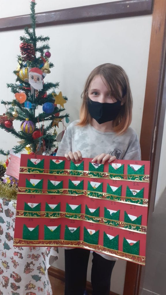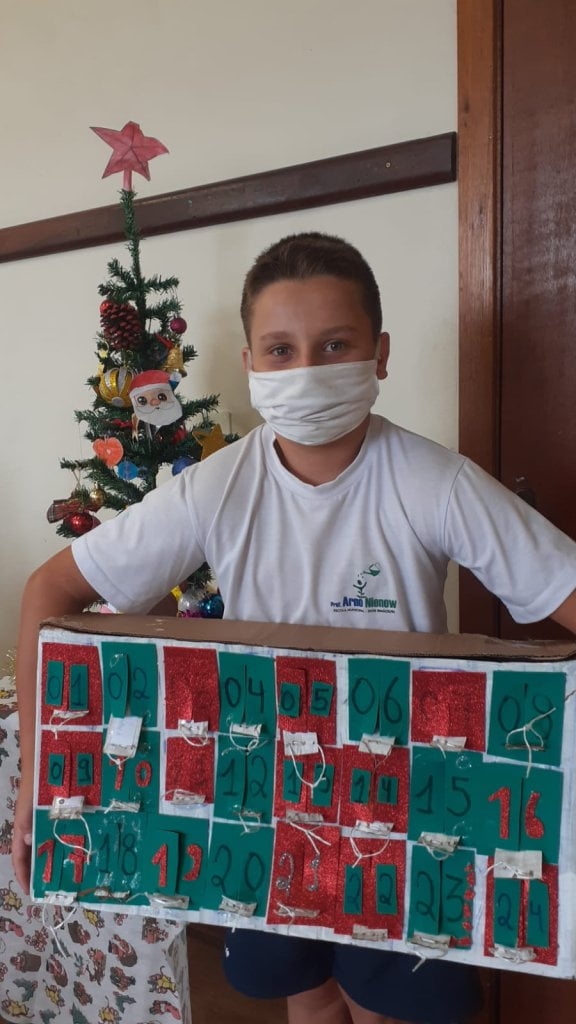 Neste clima de preparação para o Natal, as turmas de 5° ano foram desafiadas a construir um “Adventskalender” (calendário de advento), que é também um lindo costume na Alemanha. Quando no dia 1° de dezembro inicia a contagem regressiva para o Natal. Após a aula expositiva, os estudantes puderam se inspirar para criar seu próprio Adventskalender. “A proposta era criar a partir dos materiais de suas casas, envolvendo a família”, relata a professora.