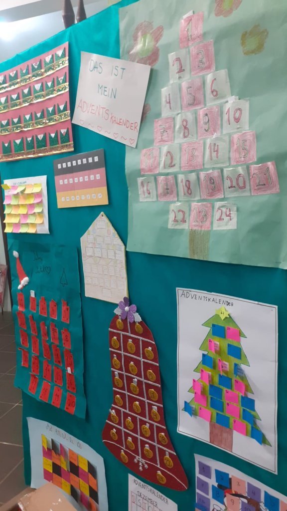 Adventskraz (coroa de advento com as quatro velas), Weihnachtsmarkt (feira de Natal), Nikolaustag (dia de São Nicolau celebrado no dia 06 de dezembro), Lieder (canções), Weinachtsplätzchen (bolachas de Natal), Tannenbaum (pinheirinho), Nussknacker (quebra-nozes) vocabulário apresentado aos estudantes do 1° ao 5° ano, através de fotos, relatos da professora e atividades.