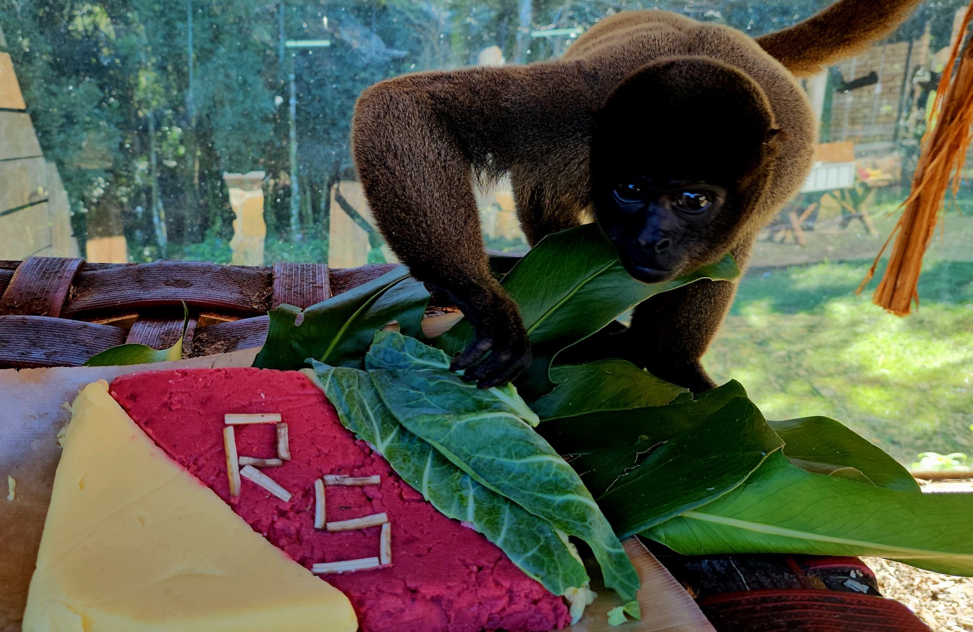 Em homenagem ao Rio Grande do Sul, a atividade de enriquecimento ambiental contou com uma polenta com as cores da bandeira gaúcha. O alimento foi distribuído para bugios, macacos-barrigudo, araras, tucanos, seriemas, papagaios e outras aves. Para colorir o item, a equipe do zoológico utilizou beterraba e folhas de couve. “Nas baixas temperaturas, suplementamos a refeição dos animais. Oferecemos nutrientes mais calóricos para que eles mantenham o bem-estar”, expressa a responsável técnica do Gramadozoo, bióloga Tathiana Gosaric de Barros.