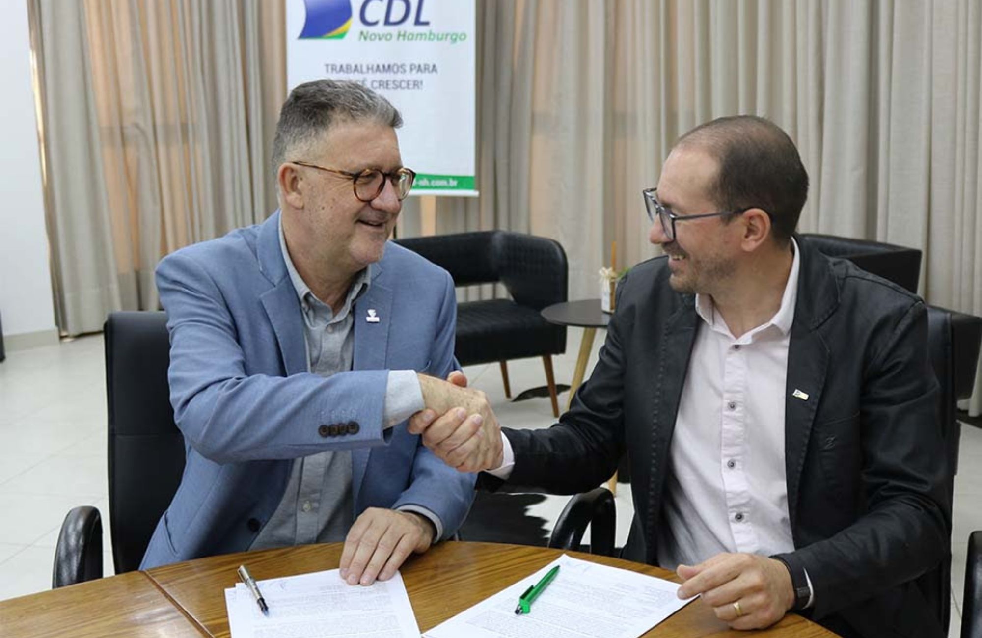 A Universidade Feevale e a Câmara de Dirigentes Lojistas (CDL) de Novo Hamburgo firmaram novo acordo de cooperação. O documento foi assinado nesta terça-feira (1/11), pelo reitor Cleber Prodanov e pelo presidente da entidade, Jaime Machado. A finalidade do convênio é estabelecer ações de colaboração mútua, no sentido de promover o desenvolvimento da região por meio do incentivo à educação. Serão concedidos descontos aos associados, dirigentes, funcionários e estagiários da CDL em cursos de graduação, pós-graduação lato sensu – MBA e especialização, extensão e idiomas. Esse público também terá desconto em serviços especializados e em atividades físicas e aquáticas oferecidas pela Feevale.